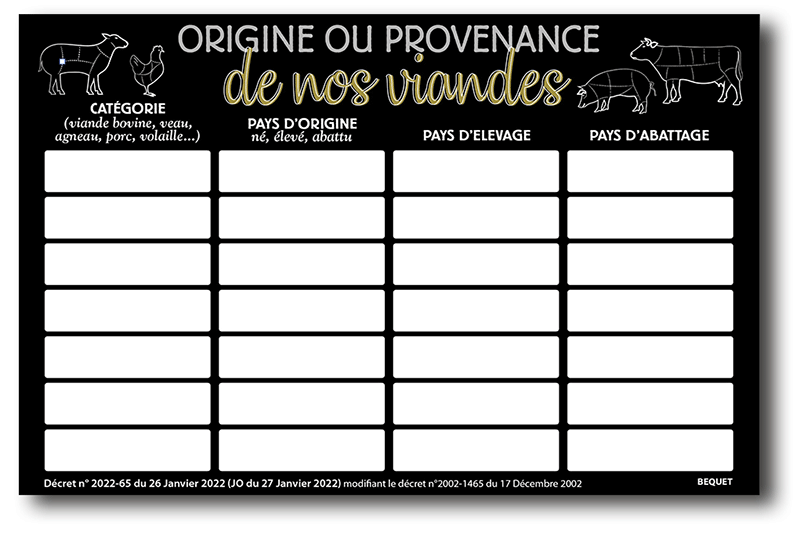 Afin d’aider les restaurants à respecter cette nouvelle obligation, Bequet vous propose une gamme de panneaux « Origine ou provenances de nos viandes » fabriqués en France, déclinés en différentes versions.